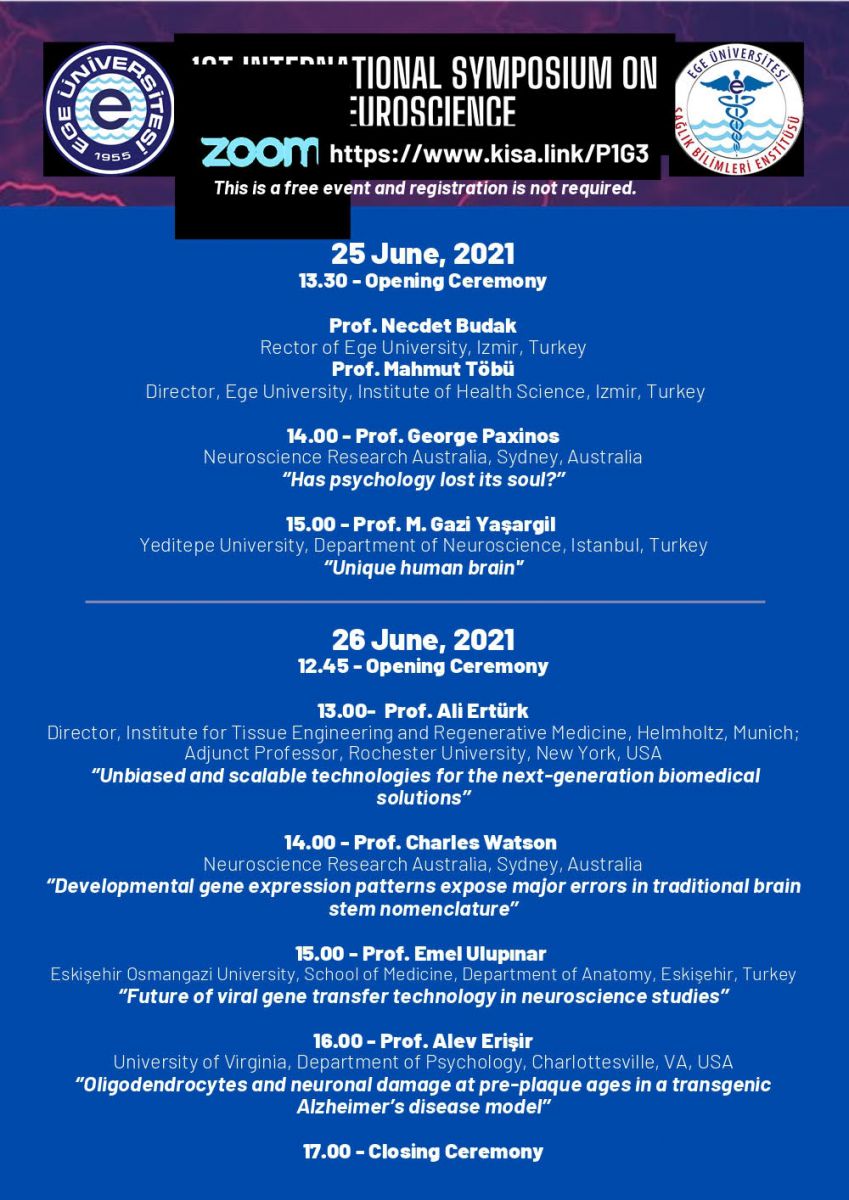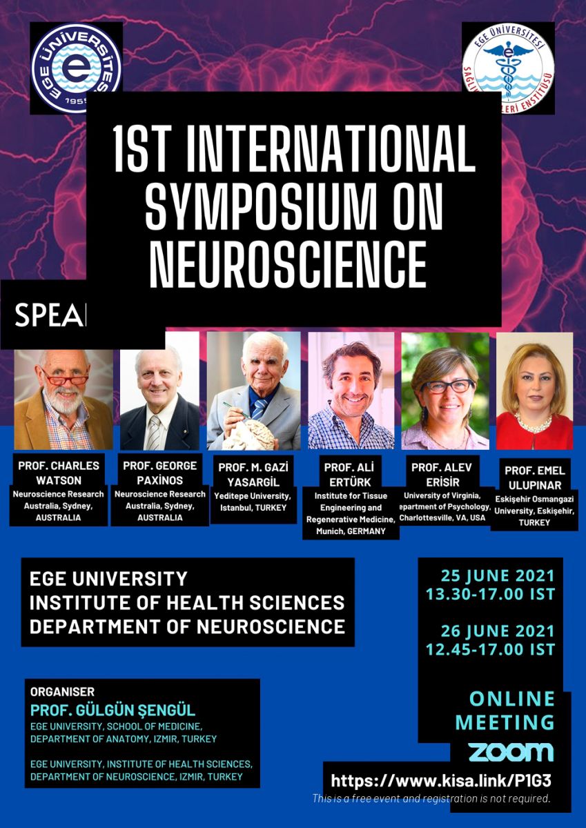 Fakültemiz Anatomi Anabilim Dalı ve Sağlık Bilimleri Enstitüsü Sinirbilim Anabilim Dalı Öğretim Üyesi Prof. Dr. Gülgün ŞENGÜL’ün düzenlediği 25-26 Haziran 2021 tarihlerinde gerçekleşecek olan “1st International Symposium on Neuroscence’’ isimli uluslararası sempozyuma çevrimiçi olarak aşağıdaki linkten katılımınızı dileriz.