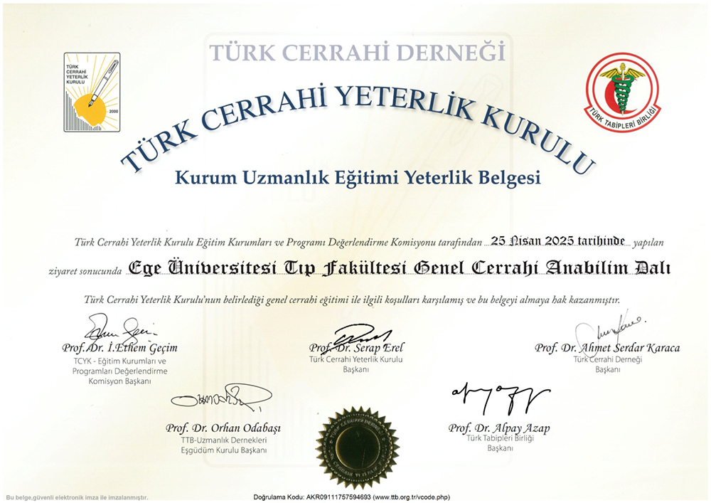 Ege Üniversitesi Tıp Fakültesi Genel Cerrahi Anabilim Dalımız, Türk Cerrahi Yeterlik Kurulu’nun belirlediği genel cerrahi uzmanlık eğitimi koşullarını başarıyla karşılamış ve 25.04.2030 tarihine kadar geçerli olmak üzere Uzmanlık Eğitimi Yeterlik Belgesi almaya hak kazanmıştır.
