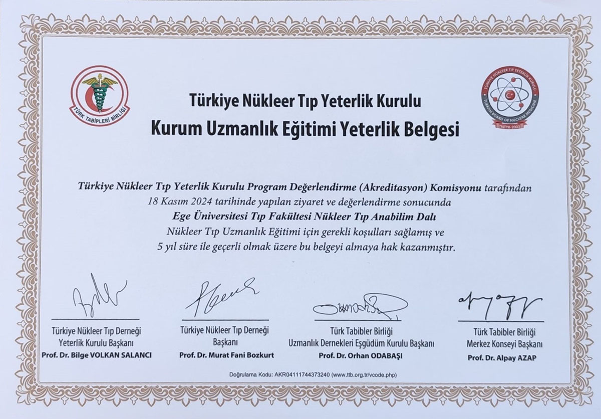 Ege Üniversitesi Tıp Fakültesi Nükleer Tıp Anabilim Dalımız, Türkiye Nükleer Tıp Yeterlik Kurulu tarafından belirlenen Nükleer Tıp uzmanlık eğitimi koşullarını başarıyla karşılamış ve 18 Kasım 2029 tarihine kadar geçerli olmak üzere Kurum Uzmanlık Eğitimi Yeterlik Belgesi almaya hak kazanmıştır.